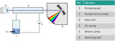 La méthode est basée sur l'absorbance de la lumière UV de NH3/H2S en phase gazeuse après avoir atteint l'équilibre liquide-gaz qui suit la loi de Henry.